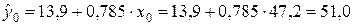 где Значение Е отн показывает, что предсказанные уравнением регрессии значения объема выпускаемой продукции Y отличаются от фактических значений в среднем на 7,1 %. Линейная модель имеет хорошую точность. По результатам проверок, проведенных в пунктах 3 — 5, можно сделать вывод о достаточно хорошем качестве линейной модели и возможности ее использования для целей анализа и прогнозирования объема выпускаемой продукции. 6. Спрогнозируем объем выпускаемой продукции Y , если прогнозное значение объема капиталовложений X составит 80 % от своего максимального значения в исходных данных: - максимальное значение X —x max =59 млн. руб. (см. «Исходные данные » в прил. 1 ); - прогнозное значение X