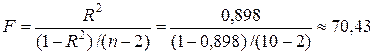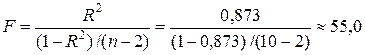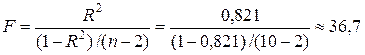возрастает в среднем на Коэффициент детерминации R 2 »0,898 показывает, что логарифмическая модель объясняет 89,8 % вариации объема выпускаемой продукции Y . F -статистика Фишера логарифмической модели определяется через коэффициент детерминации R 2 по формуле