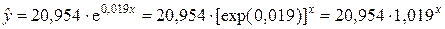 Предсказанные уравнением степенной регрессии значения объема выпускаемой продукции Y отличаются от фактических значений в среднем на 7,0 %. Степенная модель имеет хорошую точность. 3) Показательная (экспоненциальная) модель: