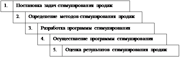 Рис. 1.1. Основные этапы подготовки и проведения мероприятий по стимулированию продаж [1, с. 329] Стимулирование продаж - система мер, направленных на стимулирование покупательского спроса, ускорение процесса товародвижения и реализации товара. Успешная программа стимулирования продаж должна отвечать следующим условиям: 1) нацеленность на удовлетворение потребностей наиболее привлекательных клиентских сегментов; 2) значительные инвестиции в формирование навыков агентов по продажам; 3) обеспечение эффективной реализации программы изменений [1, с. 329]. Разработка программы стимулирования сбыта связана с последовательным решением таких задач, как: 1) установление целей стимулирования сбыта; 2) выбор инструментов стимулирования сбыта; 3) выявление круга участников; 4) определение интенсивности мероприятий по стимулированию сбыта; 5) выбор средств распространения информации о программе стимулирования сбыта; 6) определение продолжительности стимулирования сбыта; 7) выбор времени проведения мероприятий по стимулированию сбыта; 8) разработка бюджета стимулирования сбыта [8, с. 363]. Установление целей и выбор инструментов стимулирования сбыта тесно связаны между собой. Стимулирование продаж имеет многоцелевую направленность. Выбор цели зависит от объекта предстоящего воздействия. Существует несколько типов целевых аудиторий: 1) Потребитель: он, безусловно, обладает наибольшей значимостью, и вся политика маркетинга сводится к воздействию именно на потребителя. Широкий спектр приемов стимулирования продаж был создан с единственной целью - самым эффективным образом привлечь потребителя и удовлетворить его запросы. Потребителю отдан приоритет, так как все прочие объекты являются лишь посредниками и воздействие на них оказывается для усиления воздействия на потребителя. Цели стимулирования, обращенного к потребителю, сводятся к следующему: увеличить число покупателей; увеличить количество товара, купленного одним и тем же покупателем. 2) Продавец: способность и умение продавца продать товар не должны быть оставлены без внимания со стороны производителя. В интересах фирмы стимулировать, поощрять и наращивать эти качества. Цель стимулирования, обращенного к продавцу: превратить безразличного к товару продавца в высоко мотивированного энтузиаста. 3) Торговый посредник: являясь естественным звеном между производителем и потребителем, он представляет собой специфический объект стимулирования, выполняющего в данном случае регулирующие функции. При этом цели стимулирования могут быть следующими: придать товару определенный имидж, чтобы сделать его легко узнаваемым; увеличить количество товара, поступающего в торговую сеть; повысить заинтересованность посредника в активном сбыте той или иной марки и т.д. [20, с 5]. Стимулирование персонала, осуществляющего продажи, относится к сфере его мотивации и должно способствовать увеличению объема сбыта, повышению качества обслуживания потребителей, росту профессионального мастерства, а также побуждать к внесению предложений по различным направлениям деятельности предприятия, например, по разработке и совершенствованию отдельных услуг. С этой целью могут использоваться различные стимулы - как материальные (система оплаты труда: оклад, проценты, премии и т.д.; социальный пакет: медицин
