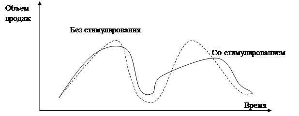 Рис. 1.3. Выравнивание сезонных продаж [8, с. 377] Последствия, вписывающиеся в рамки основных целей стимулирования сбыта (увеличение количества новых клиентов, повышение оборота), могут сопровождаться побочными результатами, знание которых необходимо для их правильной интерпретации. 1) Стимулирование не обязательно приводит к росту общего объема продаж, но, следуя феномену компенсации, смещает их во времени: потребитель пользуется представившейся возможностью и покупает продукт заблаговременно. Особенно это характерно для тех предприятий, где сбыт продуктов во многих случаях носит сезонный характер. 2) Хорошо организованное атакующее стимулирование в сочетании с целенаправленной рекламой может стать основой для долговременного воздействия на потребителя - воздействия, поддерживаемого за счет повторно совершаемых покупок и передаваемой из уст в уста рекламы, что, в свою очередь, способствует привлечению к продукту новых клиентов 3) От вспомогательного стимулирования не следует ожидать чуда, так как оно не способно изменить наметившуюся тенденцию, а скорее будет следовать ей. Так, если сбыт продукта переживает спад, то оно может дать такому продукту лишь мимолетный шанс на выживание, временно увеличив продажи. Последнее иногда только ускоряет окончательное падение объема продаж (рис. 1.5).