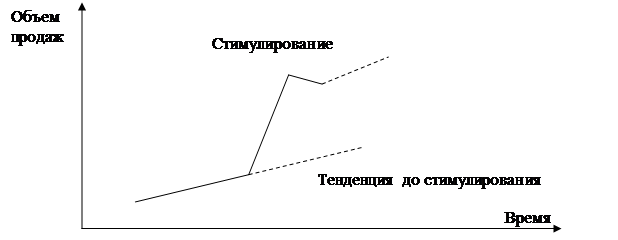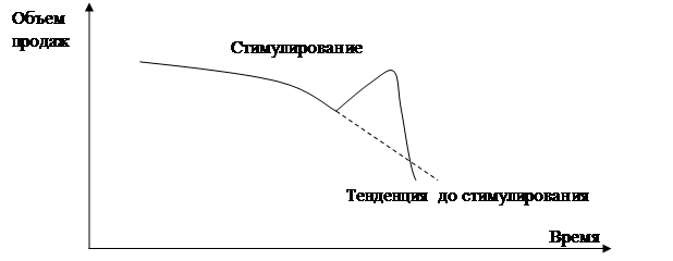 Рис. 1.2. Эффект разового вспомогательного стимулирования Вспомогательное стимулирование используется главным образом на стадии зрелости продукта или в момент, когда начинается спад его сбыта. Необходимо добиться того, чтобы такого рода мероприятия давали немедленную отдачу в части увеличения оборота, так как они отличаются кратковременностью и ограниченным временем проведения мероприятий (см. рис. 1.3).