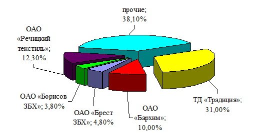 ОАО «Белгалантерея» многие годы самостоятельно осуществляло завоз импортных товаров в Республику Беларусь и обеспечивало розничную сеть г. Минска и Минской области широким ассортиментом товаров импортного производства. Однако из-за отсутствия финансовых средств, высоких кредитных ставок, усложненных таможенных процедур, сложностей в получении сертификатов на импортные товары в последние годы ОАО «Белгалантерея» завоз импортных товаров не производило. В 2008 году ОАО «Белгалантерея» получено товарных ресурсов в сумме 9722 млн. руб. Получено товаров по договорам со скидкой на сумму 6716 млн. руб., рост 110% удельный вес 69% против уровня 2007 года 65%. В 2008 году заключено 32 договора с предоставлением скидки с отпускной цены, против 24 в 2007 году. Наиболее крупные поставщики ОАО «Белгалантерея» по объемам поставок приведены на рис. 2.2.