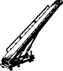Конвейер пластинчатый КП-55 тила прикреплена упорная пластина, предохраняющая грузы от соскальзывания при наклонном положении конвейера. Конвейер снабжен приемной площадкой, на которую грузы поступают с настила. По сравнению с ленточными пластинчатые конвейеры применяют для более тяжелых грузов. Общая масса одновременно находящихся на них грузов не должна превышать 420 кг. Конвейеры могут работать при наклоне до 45°. Выпускают конвейеры длиной от 4 до 40 м. Конвейеры ленточные передвижные (КНЛП-5 и др.) сходны со стационарными конвейерами. Отличие состоит в том, что в передвижных конвейерах резинотканевая лента вместе с барабанами и опорными роликами собрана на подъемной стреле. Стрела укреплена шарнирно на четырехколесной тележке (с двумя поворотными колесами). Наклон стрелы регулируют в пределах до 37° с помощью специального механизма. В рабочем положении конвейер закрепляют на месте эксплуатации с помощью четырех винтовых упоров. Передвижные ленточные конвейеры выпускают длиной от 5 до 20 м с лентой шириной 400, 500 и 650 мм. Конвейер ленточный передвижно й КНЛП-5