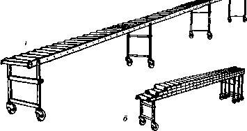 Складывающийся передвижной ленточный конвейер КНПС-4 предназначен для перемещения грузов, упакованных в тару, при погру-зочно-разгрузочных работах в торговых организациях и на складах. Конвейер состоит из тележки, складывающейся стрелы с приводным и натяжным барабанами, электропривода и ручного гидравлического насоса. Сварная рама тележки опирается на три колеса: два неповоротных и одно рояльного типа. Для устойчивости конвейера во время работы выставляются аутригеры. Стрела конвейера шарнирно укреплена на одном конце тележки и может быть установлена при помощи двух гидравлических цилиндров под любым углом к горизонтали в пределах от 12 до 37°. Угол наклона стрелы изменяют с помощью ручного гидравлического насоса. Стрела опускается нажатием кнопки спускового клапана насоса. В средней части стрелы имеется шарнир, позволяющий складывать ее части во время транспортирования или хранения конвейера после окончания работы. Перед началом работы верхнюю часть стрелы конвейера устанавливают в рабочем положении и обе половины стрелы скрепляют винтами и специальными гайками. Конвейером управляют с кнопочных станций, находящихся с правой и левой его сторон. На ленте через каждые 2 м укреплены упоры, препятствующие скольжению груза при больших углах наклона стрелы конвейера. Ленту натягивают, передвигая натяжной барабан винтами, а цепь - передвигая плиту, на которой смонтирован привод. Техническая характеристика конвейера КНПС-4 Производительность, т/ч.........................................50 Общая масса единичных грузов, находящихся на рабочей ветви конвейера, кг................................120 Скорость движения ленты, м/с .....................................0,48 Ширина ленты, мм.............................................400 Высота разгрузки груза, мм наибольшая ..............................................2900 наименьшая ..............................................13 00 Электродвигатель: тип .................................................АОЛ-32-4 мощность, кВт...............................................1 число оборотов в минуту....................................1410 Расстояние между центрами барабанов, мм........................4000 Габаритные размеры в рабочем положении, мм: длина ...................................................4100 ширина...................................................700 высота..............................................1300-2900 Габаритные размеры в сложенном виде, мм: длина ...................................................2340 ширина...........................; ........................700 высота...................................................1025 Масса, кг ................................................... .290 Роликовые конвейеры относятся к гравитационным механизмам. Они состоят из стационарного или передвижного металлического корпуса, на котором закреплены трубчатые или дисковые ролики. Конвейеры собирают из отдельных прямых секций длиной до 3 м (КРД-3) и радиальных секций - для поворотов на 45, 30, 15° (соответственно КРД-45, КРД-30, КРД-15) и др. Роликовые конвейеры бывают приводные и неприводные. На складах обычно используются неприводные, которые предназначаются для перемещения штучных и затаренных грузов в горизонтальной плоскости или под небольшим углбм . Грузы, имеющие сложную конфигурацию или в мягкой таре, перемещаются на специальных площадках или поддонах. На горизонтальном конвейере груз перемещается при помощи усилия рабочего, на наклонном - под действием собственного веса. При транспортировании грузов в деревянной таре уклон принимается 3-2°, на металлических поддонах -2-2,5°.