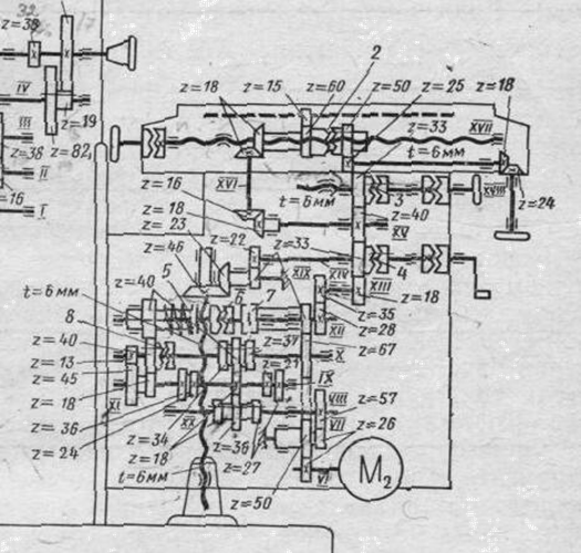 включается муфта 8. В этом случае вал X передает движение валу XII через пару зубчатых колес Также этот механизм служит для быстрого перемещения стола, салазок или консоли используют более короткий участок цепи подач. Движение от электродвигателя М2