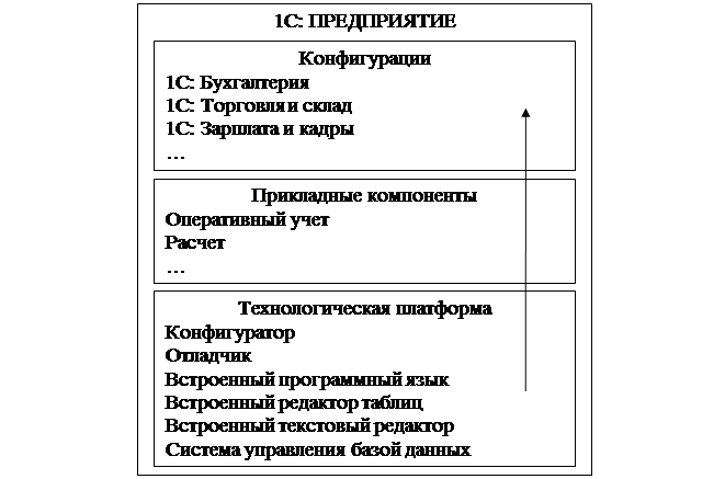 Более предпочтителен для нашего предприятия продукт «1С:Предприятие» в виду следующих причин: 1) Достаточная низкая цена по сравнению с другими продуктами. 2) Повышена производительность по сравнению с аналогичными системами. 3) Гибкая настройка под конкретное предприятие. 4) Существование стандартных механизмов перехода от более старой версии к новой, таким образом, нет необходимости создавать новую БД. 5) Ориентирована на русского пользователя. Следовательно, менее сложное обучения персонала. 1.4 Система 1С: Предприятие1С-Предприятие является гибкой настраиваемой системой для решения широкого круга задач в сфере автоматизации деятельности предприятий. На рисунке 3 приведена схема взаимодействия различных компонентов 1С: Предприятия.
