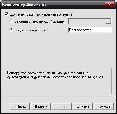 Рисунок 30 – Окно конструктора журнала. В следующем окне выбреются документы которым будет принадлежать данный отчет. В нашем случае нужно выбрать один документ- «СырьеПродукция», как показано на рисунке 31.