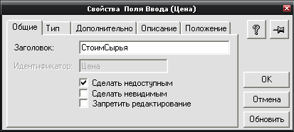 Рисунок 20 – Окно свойств кнопки. Далее создаем таблицу «ТзДоп». Здесь будет вводиться наценка и рассчитываться продажная цена. Далее добавим два поля ввода «Себестоимость» и «Всего». Разместим их ниже самой формы. Это для того, чтобы при работе в режиме 1С:Предприятие пользователю они были не видны. Столбец «СтоимСырья» сделаем недоступным для изменения, как показано на рисунке 21.