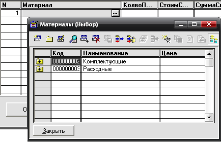 Рисунок 26 – Документ «СырьеПродукция». При открытии документа выполняется процедура «ПриОткрытии» Данная процедура задает начальные значения переменных документа и создает строки и столбцы в таблице значений «ТзДоп». Это осуществляеться с помощью операций «НоваяКолонка», «НоваяСтрока()». Программный код: Процедура ПриОткрытии() ПриЗаписиПерепроводить(1); СуммаКом=0; СуммаРас=0; тзДоп.НоваяКолонка("Инф" ,"Строка",26, ,"Информация",30); тзДоп.НоваяКолонка("Показ","Число" ,15,2,"Показатель",15); тзДоп.НоваяСтрока(); тзДоп.Инф = "Стоимость комплектующих"; тзДоп.НоваяСтрока(); тзДоп.Инф = "Стоимость расходных"; тзДоп.НоваяСтрока(); тзДоп.Инф = "Затраты на работу %"; тзДоп.НоваяСтрока(); тзДоп.Инф = "Прочие затраты%"; тзДоп.НоваяСтрока(); тзДоп.Инф = "Себестоимость"; тзДоп.НоваяСтрока(); тзДоп.Инф = ""; тзДоп.НоваяСтрока(); тзДоп.Инф = "Наценка"; тзДоп.НоваяСтрока(); тзДоп.Инф = "Продажная цена"; КонецПроцедуры Идентификаторам «СуммаКом» и «СуммаРас» присваивается нулевое значение. Далее создаются строки и колонки. В наименование выбираем название готовой продукции из справочника «Номенклатура». Задаем количество готовой продукции в партии, без этих данных будет не корректная проводка документа. При нажатии кнопки «Новая строка» сразу происходит вызов спраочника «Материалы». Далее в столбце выбираем комплектующие и расходные материалы из справочника. Как показано на рисунке 27.