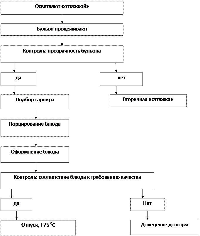 Технология приготовления Варят бульон при слабом нагреве, удаляя пену и жир. За 40-60 минут до готовности бульона в него добавляют подпеченные овощи. Готовый бульон процеживают, доводят до кипения и хранят на мармите. Для осветления бульона готовят оттяжку. Для приготовления оттяжки расходуют дополнительно кости птицы по 200г на 1000 бульона. Измельченные кости кур или индеек заливают холодной водой, добавляют соль и выдерживают 1-2ч на холоде при t 5-70 C, затем добавляют слегка взбитый яичный белок. Бульон охлаждают до 50-600 С, вводят оттяжку, хорошо перемешивают и варят при слабом кипении 1-1,5 ч, затем процеживают. Отпускают в бульонной чашке или тарелке, подогретой до 400 С. Отпускают с кусочками вареной курицы или индейки. Требования к качеству: бульон прозрачный, золотисто-желтого оттенка. . Вкус – в меру соленый, с ярко выраженным ароматом. На поверхности не должно быть блесток жира. 6 .5 Карта дефектов.