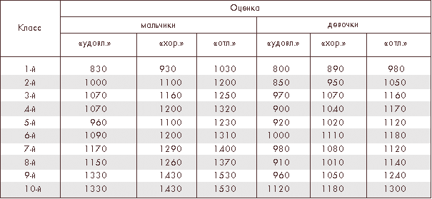 Иногда возникает необходимость оценить максимальную скорость бега. Это особенно важно при спринтерской тренировке, а также для некоторых игровых видов спорта. Здесь в качестве нормативов рекомендуем воспользоваться данными таблицы 2. Проведение такого тестирования требует специальной подготовки дистанции: должны быть размечены отрезок 20 м (скорость на котором идет в зачет), а также дистанция предварительного разбега. Испытуемый при таком тестировании должен разбежаться заранее и пробежать зачетные 20 м уже с максимальной, практически постоянной скоростью. Для регистрации времени бега в этом случае необходим секундомер, тогда как в двух предыдущих случаях можно воспользоваться часами с секундной стрелкой. Приведенные в таблице 2 результаты – средние для соответствующих половозрастных групп, то есть эквивалентны оценке «4» (хорошо). Таблица 2