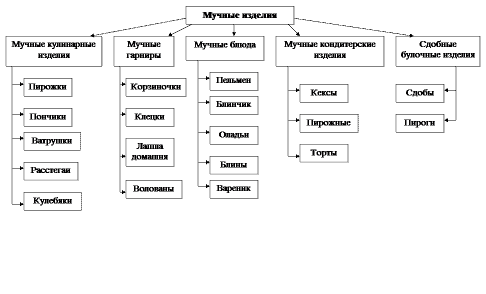 Рисунок 1 - Классификация мучных изделий 1.3 Требования к качеству кулинарной продукции, условия и сроки хранения Готовые изделия из любого вида теста должны быть правильной формы, с ровной верхней коркой, плотно прилегающей к мякишу. Трещины на поверхности недопустимы. Цвет изделий - от золотисто-желтого до светло-коричневого, цвет белково-воздушного печенья - белый. Мякиш изделий должен быть хорошо пропеченным, эластичным (в дрожжевом и бисквитном тесте), равномерно пористым, без пустот. Вкус и запах должны соответствовать виду изделия и его составу, не допускается привкус горечи, излишняя кислотность, соленость. Хранят готовые изделия в чистых, сухих помещениях. с температурой 6 - 20° С в лотках, укладывая их так, чтобы они не потеряли форму. Срок реализации 24 ч. Готовые блины и оладьи хранят до отпуска сложенными стопками в посуде с закрытой крышкой, чтобы дольше сохранять их горячими [14]. 2. РАЗРАБОТКА ТЕХНОЛОГИИ ПРОИЗВОДСТВА 2.1 Характеристика сырья Мучные изделия приготавливают из муки тонкого помола высшего или первого сорта с добавлением молока или воды, сахара, жира, яиц, сметаны и некоторых других пищевых продуктов. Большинство мучных изделий готовят с дрожжами. 2.1.1 Характеристика пшеничной муки ГОСТ Р 52189-2003 Мука пшеничная. в/с 1 с 2 с Клейковина, % 28 30 29 Белизна усл. ед. 58 48 35 Влажность, % 14,0 14,2 13,2 Качество ИДК ед. 60 75 80 Группа 1 1 11 Мука пшеничная – порошкообразный продукт, который получают в результате размола зерна пшеницы. Пшеничную муку хлебопекарную вырабатывают для розничной торговли, кондитерской и хлебопекарной промышленности. По качеству ее подразделяют на крупчатку, муку высшего, 1 и 2-го сортов, а также обойную. Муку высшего сорта изготавливают из мягких стекловидных и полустекловидных пшениц. Мука высшего сорта очень мягкая, тонкого помола, цвет ее белый, со слабым кремовым оттенком, вкус сладковатый. Качество муки характеризуется не только ее цветом, но и влажностью, помолом, запахом, вкусом, кислотностью, содержанием белковых веществ, углеводов, жира, ферментов, минеральных веществ, вредных примесей. Химический состав муки зависит от пшеницы, сорта муки и режима помола [5]. 2.1.2 Характеристика сахара ГОСТ 21-95 Сахар-песок – это белый кристаллический порошок, который вырабатывается из сахарной свеклы и сахарного тростника. В сахаре-песке 99,7 % сахарозы и 0,14% влаги. Сахар растворяется в воде, не имеет запаха и посторонних привкусов. В мучных и кондитерских изделиях сахар меняет структуру теста, придает им вкус и повышает калорийность. Сахар снижает водопоглощающую способность муки и упругость теста. Повышенное содержание сахара разжижает тесто. Перед использованием сахар просеивают через сито с ячейками не более 3 мм [6]. 2.1.3 Характеристика яйца куриного ГОСТ Р 52121 – 2003 Скорлупа должна быть чистой, без пятин крови и помета, и неповрежденной. Допускается : - на скорлупе диетических яиц наличие единичных точек или полосок - на скорлупе столовых яиц – пятен, точек и полосок занимающих не более 1/8 поверхности. Допускается загрязненные яйца обрабатывать специальными моющими средствами, разрешенными к применению уполномоченными организациями в установленном порядке. Яйца предназначенные для длительного хранения, не следует мыть. Содержимое яиц не должно иметь посторонних запахов. Содержание токсичных элементов, антибиотиков,