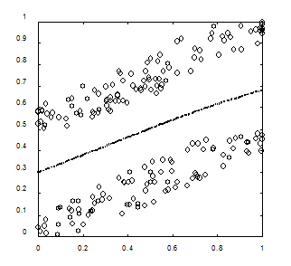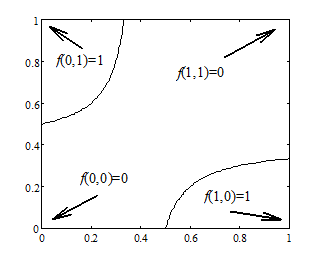 Каждый процессорный элемент k -го порядка способен выполнить не только линейное разделение областей в пространстве входов, но также и произвольное разделение, задаваемое поли-линейной функцией нескольких аргументов. Семейство решающих правил, определяемых нелинейным нейроном значительно богаче, чем множество линейно разделимых функций. На Рис. 1 приведен пример решающего правила, задаваемого одним нейроном второго порядка, для классической линейно неразделимой задачи "исключающее ИЛИ ".