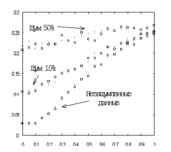 Рис. 3 Зависимость ошибки обучения EL (кружки) и ошибки обобщения EG (точки) от степени некорректности h обратной задачи при различных уровнях шума На Рис. 3 представлено изменение ошибки обучения (и практически совпадающей с ней ошибки обобщения) при росте скачка моделируемой функции. Ошибка при различных уровнях шума прямо пропорциональна величине скачка, определяемого параметром некорректности h . Для сильно некорректной задачи (h=1 ) результаты полностью не зависят от шума в данных. Теоретически, для неограниченного обучающего набора для моделируемых систем имеется точное (линейное) решение, минимизирующее среднеквадратичное уклонение, которое в предельном случае (h =1) дает значение ошибки 0.25. Расчетное значение на Рис.3 в этом наихудшем случае близко к данной теоретической величине. Таким образом, скейлинг ошибки обучения выявляет степень некорректности задачи независимо от присутствия аддитивного шума в обучающих данных. Данные шум может быть вызван как неточностью измерений, так и эффектом "скрытых" параметров, неучтенных в модели. На следующем рисунке приведено регуляризованное решение предельно некорректной задачи (h =1), даваемое нейронной сетью с обратным распространением, обученной на зашумленных данных.