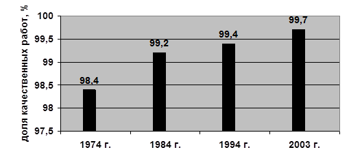 Рис. 10. Уровень качества выполненных ремонтных работ в ОАО «ММРЗ» за ряд лет. Как видно, из рис. 10, не смотря на снижение объемов выполненных ремонтных работ, начиная с 1984 года, число дефектных работ снижается, а, следовательно, наблюдается рост уровня качества основных ремонтных работ ОАО «ММРЗ» Система управления качеством в ОАО «ММРЗ» как таковая отсутствует. Отдел технического контроля, созданный на заводе, выполняет лишь одну функцию– контроль качества ремонтируемых изделий. Современные фирмы сосредотачивают внимание не на выявлении брака, а на его предупреждении, на тщательном контролировании производственного процесса и осуществляют свою деятельность в соответствии с концепцией «регулирования качества». Теория и практика управления качеством в России имеет многолетнюю историю применения широкого диапазона форм и методов на различных этапах развития производительных сил общества. Управление качеством прошло Эволюционный путь развития – от простых операций контроля параметров изделий до комплексных систем управления качеством продукции и производством. На отечественных предприятиях зародились и последовательно применялись такие системы управления, как БИП, СБТ, КАНАРСПИ, НОРМ и другие. Комплексный, системный подход, учет всех факторов, влияющих на качество, использование основ теории управления, средств и методов стандартизации, метрологии, контроля качества обеспечили широкое и эффективное применение этих систем и распространение их принципов на более высокие иерархические уровни управления – на отрасли и административные территории (город, область, республика). В условиях рыночной экономики комплексные системы управления качеством не утратили своей актуальности и могут с успехом применяться при внедрении стандартов ИСО серии 9000, разработчики которых взяли на вооружение все ценное и полезное из отечественного опыта. Принципиальное отличие создаваемых на предприятиях систем качества заключается в их четкой направленности на удовлетворение конкретных запросов потребителей. Поэтому при разработке систем качества должны учитываться такие не предусмотренные ранее аспекты, как защита потребителей от опасной продукции, участие предприятий в конкурентной борьбе за рынки сбыта. И другие. Зарубежный опыт управления качеством базируется на единых подходах и методах работы. Наиболее распространенные статистические методы контроля качества включены в международный стандарт ИСО 9004-4 и рекомендованы для широкого применения [17, с. 368]. На многих фирмах зарубежных стран большое внимание уделяется кружкам качества, позволяющим активизировать творческий потенциал трудящихся и успешно решать возникающие на производстве проблемы качества. В то же время каждая страна имеет характерные особенности в практическом применении общих принципов управления качеством. Американский подход отличается жестким контролем качества изготовления продукции на основе математико-статистических методов, планирования производства по количественным и качественным показателям с системой административного контроля за исполнением планов, большой пропагандисткой работы на национальном уровне по поддержке своих товаропроизводителей и созданию им благоприятных условий на рынке. Японский опыт характеризуется широк