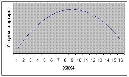 Рис. 7.1 Вид графика квадратичной зависимости цены от соотношения этажности дома и этажа квартиры. Здесь величина Х3/Х4 изменяется от 1 до 16, т.к. 16 - это максимальная величина этажности, встречающаяся в анализируемой статистической выборке. Т.о. зависимость цены квартиры от фактора Х3/Х4 должна быть квадратичной, а коэффициент при этом регрессоре – отрицательным. Чтобы проверить эту гипотезу, строится новая модель 1.4. Она получается с помощью замены в модели 1.3 регрессора Х3/Х4 на регрессор (Х3/Х4)^2. Таблица 7.1 Результаты оценки параметров модели 1.4.