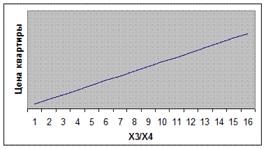 Сопоставляя оценки этих двух моделей, можно сделать следующие выводы: 1. Коэффициент при регрессоре Х3/Х4 в модели 1.3 значим (Prob.= 0.0217), а коэффициент при регрессоре (Х3/Х4)^2 незначим (Prob.= 0.0750). 2. Значения простого и скорректированного коэффициентов детерминации в модели 1.3 больше, чем в модели 1.4. Т.о. приведение регрессора Х3/Х4 к квадратичной форме ухудшает качество модели, поэтому оно нецелесообразно. Исходя из изложенного выше, можно сделать вывод, что цена предложения квартиры линейно зависит от соотношения этажности дома и этажа квартиры. График, схематично описывающий эту зависимость, представлен на рисунке 7.2.