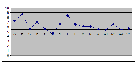 График 1. Распределение результатов по тесту Р.Кеттелла По результатам данной таблицы 1 можно выделить высокие значения по шкалам: А (общительность), В (интеллект), Е (доминантность), I (чувствительность). Факторы H, L направлены в сторону повышения баллов – 6.65 и 6.45. Фактор G (нормативное поведение) имеют тенденцию к снижению баллов – 4.65. Факторы ( F, O, M, N, O, Q1, Q2, Q3, Q4) имеют средние значения. Дополнительный фактор F3 (сензитивность) имеет низкое значение - 3.3. 3. Самоактуализированный тест (САТ). Обработка данных производилась при помощи ключа к опроснику САТ. При использовании САТ в качестве исследовательской методики авторы-создатели опросника рекомендуют пользоваться «сырыми баллами». Таблица 2. Средние значения консультантов ТД