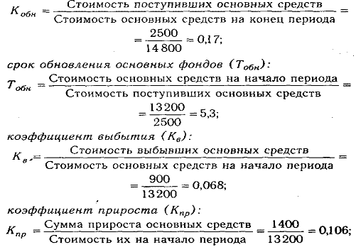 для выявления резервов повышения эффективности использования основных фондов на основе оптимизации их структуры. Большой интерес при этом представляет соотношение активной и пассивной частей, силовых и рабочих машин, так как от их оптимального сочетания во многом зависят фондоотдача, фондорентабельность и финансовое состояние предприятия. Как видно из таблицы 1, за отчетный период произошли существенные изменения в наличии и структуре основных средств. Сума их возросла на 1600 тыс. руб., или на 12%. Значительно увеличился удельный вес активной части фондов, что следует оценить положительно. Большое значение имеет анализ движения и технического состояния основных производственных фондов, который проводится по данным бухгалтерской отчетности (форма № 5). Для этого рассчитываются следующие показатели: коэффициент обновления (Кобн), характеризующий долю новых бондов в общей их стоимости на конец года: