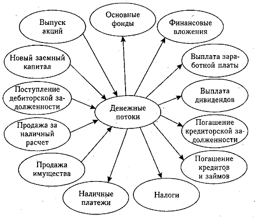 Уровень технической вооруженности труда определяется отношением стоимости производственного оборудования к среднесписочному числу рабочих в наибольшую смену. Темпы его роста сопоставляются с темпами роста производительности труда. Желательно, чтобы темпы роста производительности труда опережали темпы роста технической вооруженности труда. В противном случае происходит снижение фондоотдачи. 2. Анализ движения денежных потоковУправление денежными средствами имеет такое же значение, как и управление запасами и дебиторской задолженностью. Искусство управления оборотными активами состоит в том, чтобы держать на счетах минимально необходимую сумму денежных средств, которые нужны для текущей оперативной деятельности. Сумма денежных средств, которая необходима хорошо управляемому предприятию, - это по сути дела страховой запас, предназначенный для покрытия кратковременной несбалансированности денежных потоков. Она должна быть такой, чтобы ее хватало для производства всех первоочередных платежей. Поскольку денежные средства, находясь в кассе или на счетах в банке, не приносят дохода, а их эквиваленты - краткосрочные финансовые вложения с низкой доходностью, их нужно иметь в наличии на уровне безопасного минимума. Увеличение или уменьшение остатков денежной наличности на счетах в банке обусловливается уровнем несбалансированности денежных потоков, т.е. притоком и оттоком денег. Превышение притоков над оттоками увеличивает остаток свободной денежной наличности, и наоборот, превышение оттоков над притоками приводит к нехватке денежных средств и увеличению потребности в кредите. На рисунке 1 стрелки, направленные внутрь, показывают притоки денежных средств, наружу - оттоки.