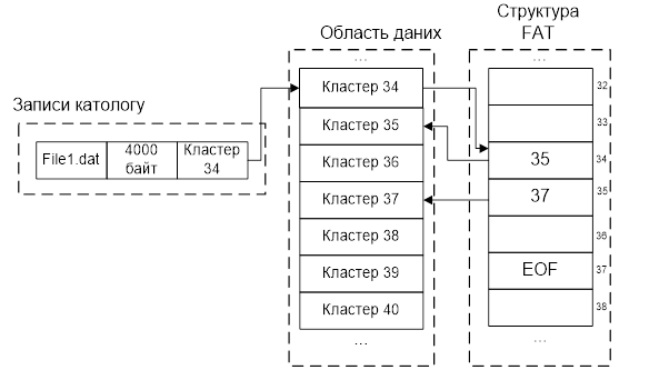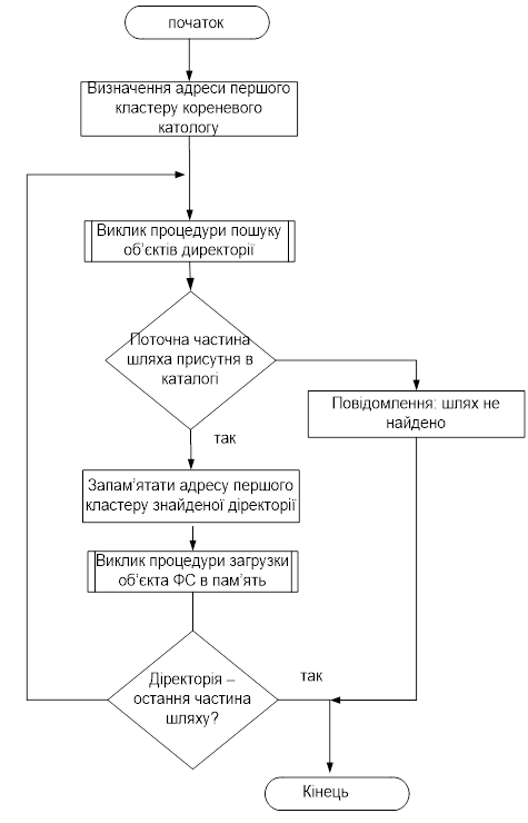 Рисунок 3.1 – Пошук та найменування дисків 3.2 Алгоритм доступу к об’єктам файлової системи Основна концепція файлової системи FAT полягає в тім, що кожному файлу й каталогу виділяється структура даних, називана дескриптором. У цій структурі зберігається ім'я файлу, його розмір, початкова адреса вмісту файлу й інші метадані. Данні файлів і каталогів зберігається в блоках даних, називаних кластерами. Якщо файлу або каталогу виділяється більш одного кластера, інші кластери знаходять за допомогою структури даних, називаної FAT(File Allocation Table). Структура FAT використовується як для ідентифікації наступних кластерів у файлах, так і для визначення стану кластерів. Існує три версії FAT: FAT12, FAT16 і FAT32. Вони відрізняються друг від друга насамперед розміром запису у структурі FAT. Зв'язки між структурами даних показано на рис. 3.4.