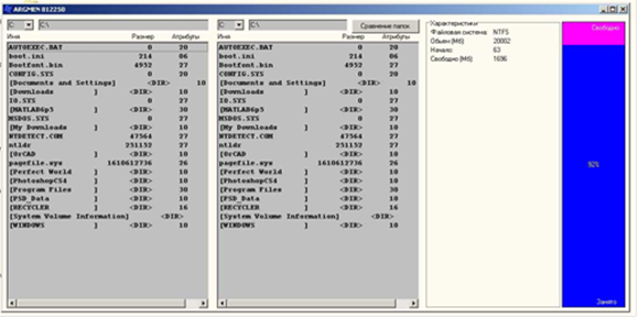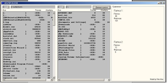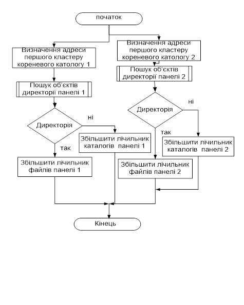 Рисунок 3.5 – Алгоритм зрівняння директорій 4 ОПИС ПРОГРАМНИХ МОДУЛІВ Точка входу знаходиться у модулі з назвою manager.cpp. Після автоматичної ініціалізації графічного інтерфейсу (все це відбувається за рахунок VCL), виконується пошук і іменування всіх логічних дисків. Код, відповідальний за це, знаходиться в модулі mbrmodule.cpp. Далі, якщо знайдено завантажувальний розділ і, якщо файлова система на ньому є однією з підтримуваних, виконується пошук усіх файлів у кореневому каталозі. Якщо файлова система розділу - FAT або FAT32 то робиться це за допомогою модуля fat32.cpp. Якщо файлова система – NTFS, то пошук виконується невеликими функціями, описаними, безпосередньо, у головному модулі (manager.cpp, на таку структуру вже наголошувалося раніше). Інші файлові системи не підтримуються. Короткий опис ключових функцій: PHARDINFO Init(char n); Функція виконує всі попередні дії, необхідні для подальшої роботи з жорстким диском(виклик CreateFіle(), визначення розміру сектора й т.д.). У випадку невдачі повертає NULL. BOOL WalkOnMBR(PHARDINFO inf, PPLOGICAL_DISC first); Функція проходить по ланцюжку MBR жорсткого диска, попередньо відкритого функцією Іnіt void DeInit(PHARDINFO inf); Звільняє зайняту структурами пам'ять і закриває дескриптор жорсткого диска PDISC_INFO Fat32Init(char disc); Виконує всі необхідні попередні дії для роботи з логічним диском, файлова система котрого FAT або FAT32 (зчитування таблиці FAT, визначення кластера кореневого каталогу та ін.) UINT GotoDir(PDISC_INFO info, char* cpPath); Повертає номер кластера виходячи зі шляху до директорії UINT ListDirectory(PDISC_INFO info, HDIR hDir,UINT dwDirSize,char* cpObjectName, PFILES* ppfiles); Виконує побудова списку файлів у директорії або пошук елемента каталогу в ній. PFILES PrintRootDirectory(PDISC_INFO info); Пошук всіх файлів у кореневому каталозі HDIR LoadDirectory(PDISC_INFO info, UINT cluster, UINT* dirsize); Завантажує вміст зазначеного ланцюжка кластерів на згадку char* Fat32ReadFile(PDISC_INFO info, UINT FirstCluster, UINT* dwFileSize); Читає вміст файлу, перший кластер котрого відомий void Fat32DeInit(PDISC_INFO info); Звільняє зайняту пам'ять і закриває дескриптори. void AnalyzeError(char* comment, int iErr); Виконує аналіз помилки, що відбулася, результати виводить в MessageBox головного вікна void createFolder(PDISC_INFO info,AnsiString newDirName) Виконує додаткове завдання КП. Створення директорії в FAT16/32. Приймає у якості параметрів структуру інформації про поточний розділ та назву нової директорії. Функція отримує інші необхідні дані та інтерфейс до роботи з раніше створених функцій та глобальних змінних (ознака кореневої директорії, поточний шлях, тип ФС та ін.). 5 МЕТОДИКИ РОБОТИ Для навігації серед елементів каталогу та серед списку логічних дисків використовуються дії миші. Для порівняння директорії – окрема кнопка «Сравнение папок». Для вибору поточного диску – випадаючий список з усіма літерами наявних дисків. Після натискання на кнопку порівняння директорій, замість данних про поточний логічний диск, з’являється інформація щодо відкритих директорій в панелях менеджеру.. При зміні поточного диску відбувається оновлення інформації про диск у правій частині вікна, та якщо зміна диска була у правому вікні, то й там є відновлення. та оновлюється гістограма зайнятого/вільного простору. 6 ДОСЛІДЖЕННЯ РЕЗУЛЬТАТІВ Відразу після запуску формується інтерфейс користувача й виводиться вміст кореневого каталогу активного розділу. Виводиться наступна інформація про файли: ім'я файлу, розмір, атрибути. Також у праві1 частині вікна виводиться деяка інформац