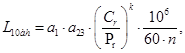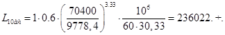 Расчетный скорректированный ресурс при a1 =1 (вероятность безотказной работы 90% (см. [1], табл. 7.5)), a23 = 0.6 (обычные условия применения (см. [1], стр. 108)) и k = 3.33 (роликовый подшипник)