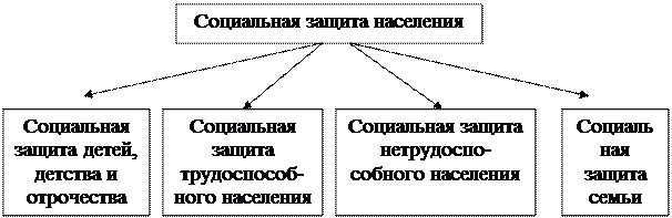 Рисунок 1.1 Механизм реализации социальной защиты населения* *Источник: составлено автором самостоятельно Первое направление социальной защиты - это социальная защита детей, детства и отрочества, которая ориентирована на создание условий жизни и развития детей, позволяющих всем детям, независимо от того, в какой семье они родились и живут, иметь наилучшие возможности для сохранения здоровья, материального благополучия, свободного доступного образования, дошкольного и школьного воспитания, гармоничного духовно-нравственного развития, реализации своих способностей. Государственная политика в интересах детей основана на принципах законодательного обеспечения прав ребенка; государственной поддержки семьи в целях обеспечения полноценного воспитания детей, защиты их прав, подготовки их к полноценной жизни в обществе; установления и соблюдения государственных минимальных социальных стандартов основных показателей качества жизни детей с учетом региональных различий данных показателей; ответственности должностных лиц, граждан за нарушение прав и законных интересов ребенка, причинение ему вреда; государственной поддержки органов местного самоуправления, общественных объединений и иных организаций, осуществляющих деятельность по защите прав и законных интересов ребенка. Соответственно, социальная защита детей и подростков должна эффективно оберегать детей всех возрастных групп, а также периодов развития от социальных рисков. Особое значение для социальной защиты детей на современном этапе приобретает создание специализированных учреждений для несовершеннолетних, которые призваны оказывать помощь той категории подростков, которая раньше не пользовалась вниманием властей. Брошенные семьей и школой, они в лучшем случае интересовали лишь правоохранительные органы в связи с совершением противозаконных действий. В нарушение международных правовых норм дети и подростки, не совершившие правонарушений, нередко подолгу содержались в приемниках-распределителях органов внутренних дел, ожидая направления в детские учреждения интернатного типа. Таким образом, социальная защита детей и подростков на современном этапе согласуется с государственной политикой в области детства, которая признает этот период жизни человека важнейшим этапом, а потому обязывается делать все, чтобы подготовить их к полноценной жизни. Социальная защита детей и подростков характеризуется многонаправленностью, затрагивая самые различные сферы их жизнедеятельности, однако приоритетным направлением работы является работа с детьми и подростками, страдающими той или иной степенью социальной дезадаптации, которая приводит их на улицу, к наркотикам, проституции и т. д. Второе направление социальной защиты – это социальная защита трудоспособного населения, призванная «предусматривать создание условий, обеспечивающих баланс прав, обязанностей и интересов граждан, когда человек сможет в полной мере реализовать способность к экономической самостоятельности, при этом, не ущемляя интересы сограждан и участвуя в социальном вспомоществовании нуждающимся». Труд, его вознаграждение и, как результат, денежные сбережения, приобретенные ценные бумаги и недвижимость должны стать основными источниками доходов и социального благополучия чел