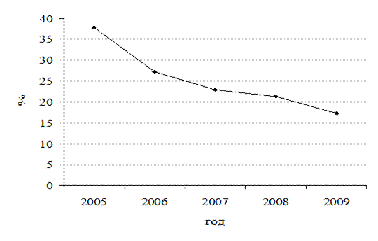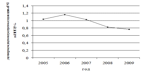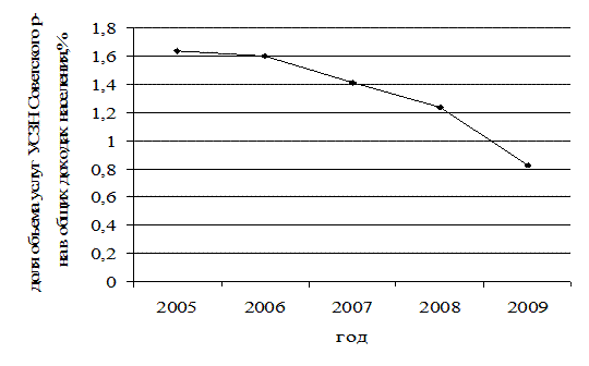 Рис. 2.2 Доля расходов на услуги соцзащиты УСЗН Советского р-на г.Орска в ВРП Оренбургской области за 2005-2009гг.* *Источник: составлено автором самостоятельно