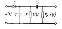 Рис. 4. Детектор кваэигармонических колебаний . Разделительная цепь Rp Cp задерживает только постоянную составляющую, пропуская флуктуацииe(t) без потерь. При действии на входе линейного детектора квазигармонического колебания с огибающей U(t) на резисторе R нагрузки образуется случайное напряжение x(t): x(t) =KД U(t) (2.4) где КД — коэффициент передачи детектора. Плотность вероятности напряжения Е, так же как и для огибающей, подчиняется закону Релея: