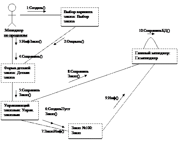2.2.4.Диаграмма кооперации. Главная особенность диаграммы кооперации заключается в возможности графически представить не только последовательность взаимодействия, но и все структурные отношения между объектами, участвующими в этом взаимодействии. На диаграмме в виде прямоугольников изображаются участвующие во взаимодействии объекты, содержащие имя объекта, его класс: выбор варианта заказа, форма деталей заказа, управляющий заказами, заказ, главный менеджер. Далее на диаграмме указываются ассоциации между объектами в виде различных соединительных линий. Между объектами изображаются динамические связи – потоки сообщений – в виде соединительных линий, над которыми располагается стрелка с указанием направления, имени сообщения, порядкового номера в общей последовательности инициализации сообщений.