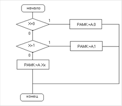 вычисляется следующим способом: из РП по адресу В1 извлекается РОН который складывается со смещением D1. В результате получаем адрес операнда в ОП . В зависимости от последних 2-х битов адреса извлекаем соответствующий байт и проводим операцию “И непосредственное ". Затем результат записываем на место 1-го операнда и производим запись полученного регистра в память. Признак результата устанавливается в соответствии вышеописанного условия.