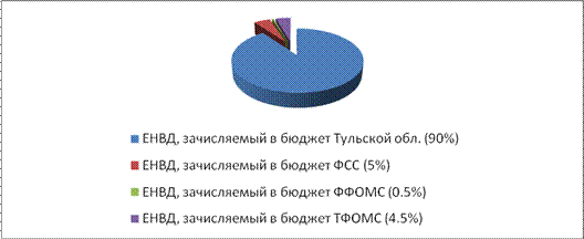Рис. 2.1. Общий вид карточки расчетов с бюджетом 2.2. Анализ методики исчисления и уплаты единого налога на вмененный доход для отдельных видов деятельности Как было рассмотрено в первой главе, ЕНВД для отдельных видов деятельности относится к специальным налоговым режимам. Но поступления от его сборов служат источником формирования как муниципальных бюджетов, так и бюджетов фондов социального страхования и обязательного медицинского страхования. Нормативы распределения ЕНВД для отдельных видов деятельности по уровням бюджетов устанавливаются Бюджетным кодексом РФ (рис. 2.2.) [1]. ЕНВД подлежит зачислению: - в бюджет муниципального образования – по нормативу 90 %; - в бюджет Фонда социального страхования РФ – по нормативу 5 %; - в бюджет Федерального фонда обязательного медицинского страхования – по нормативу 0,5 %; - в бюджет территориального государственного внебюджетного фонда обязательного медицинского страхования – по нормативу 4,5 %.