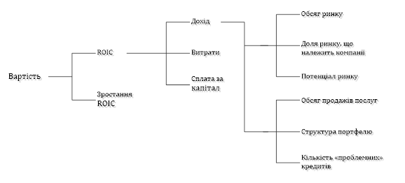 Для деталізації показників корисним буде структурування їх на окремі компоненти, що безпосередньо формують показники ROIC та ROE та показують їх безпосередню участь у створенні вартості компанії. Приклад для ROIC наведено нижче на малюнку 2.1.: