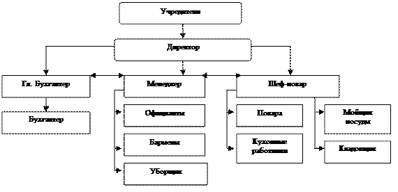 Директор- подчиняется непосредственно учредителя. Оформляет документы, необходимые для осуществления деятельности по оказанию услуг общественного питания. Обеспечивает предоставление клиентам необходимой и достоверной информации об оказываемых услугах. Осуществляет организацию, планирование и координацию деятельности ресторана. Обеспечивает высокий уровень эффективности производства, внедрение новой техники и технологии, прогрессивных форм обслуживания и организации труда. Осуществляет контроль над рациональным использованием материальных, финансовых и трудовых ресурсов, производит оценку качества обслуживание клиентов. Заключает договоры поставки продовольственных товаров, контролирует сроки, ассортимент, количество и качество их поступления и реализации. Предоставляет отчетность о производственной деятельности, в том числе владельцу ресторана. Представляет интересы ресторана и действует от его имени. Устанавливает служебные обязанности для подчиненных ему работников и принимает меры по обеспечению их исполнения. Принимает решения о назначении, перемещении и освобождения от занимаемых должностей работников ресторана, применяет меры поощрения отличившихся работников, налагает взыскания на нарушителей производственной и трудовой дисциплины. Главный бухгалтер - руководство осуществлением бухгалтерского учета и отчетности, контроль за своевременным и правильным оформлением бухгалтерской документации. Контроль за рациональным и экономным использованием материальных, трудовых и финансовых ресурсов. Контроль за правильным отражением на счетах бухгалтерского учета всех хозяйственных операций и их соответствием законодательству. Осуществление экономического анализа финансово-хозяйственной деятельности по данным бухгалтерского учета и отчетности в целях выявления и мобилизации внутрихозяйственных резервов, устранения потерь и непроизводственных затрат. Формирование учетной политики с разработкой мероприятий по ее реализации. Оказание методической помощи работников подразделений и служб по вопросам бухгалтерского учета, контроля, отчетности и экономического анализа руководство обеспечением составления экономически обоснованных отчетных калькуляций себестоимости продукции (работ, услуг), расчетов по заработной плате, начислений и перечислений налогов и сборов в бюджеты разных уровней, платежей в банковские учреждения руководит работниками бухгалтерии. Менеджер - осуществляет контроль за рациональным оформлением зала, барных стоек, витрин, и т.д. Осуществляет проверку выписанных счетов и производит расчет с посетителями. Принимает меры к предотвращению и ликвидации конфликтных ситуаций. Рассматривает претензии, связанные с неудовлетворительным обслуживанием посетителей, и проводит соответствующие организационно-технические мероприятия. Принимает заказы и разрабатывает планы проведения и обслуживания юбилейных торжеств, свадеб, банкетов. Контролирует соблюдение работниками организации трудовой и производственной дисциплины, правил и норм охраны труда, техники безопасности, требований производственной санитарии и гигиены. Информирует руководство организации об имеющихся недостатках в обслуживании посетителей, принимает меры к их ликвидации. Составляет график раб