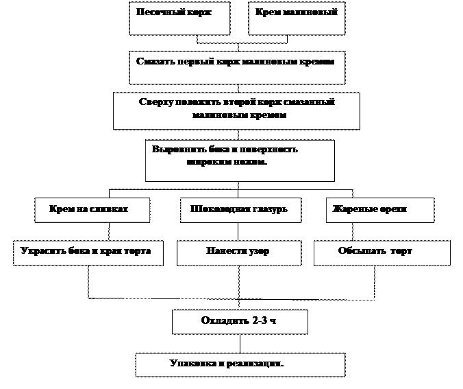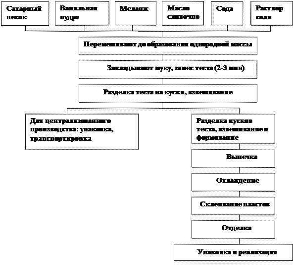 Технологический процесс в кондитерском цехе осуществляется по схеме: подготовка продуктов —> приготовление и выпечка теста и изделий —> остывание —> отделка —> укладка —> охлаждение и хранение —> транспортирование.