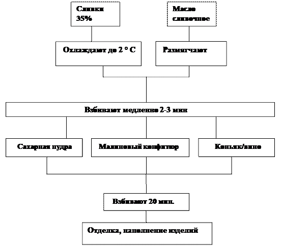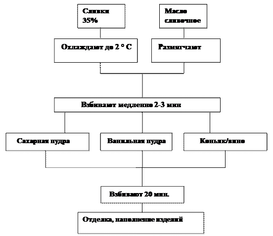 Технология приготовления крема на сливках. Для приготовления крема используют сливки 35%-ной жирности. Такие сливки при взбивании дают пышную устойчивую массу. Однако этот крем неустойчив при хранении, быстро расплывается, теряет форму, закисает. Сливки охлаждают до 2 ° С ,добавляют размягченное сливочное масло и взбивают в прохладном помещении, пользуясь охлажденным инвентарем, до пышной устойчивой пены. Вначале (2 - 3 мин) взбивают медленно, затем темп взбивания увеличивается. Не прекращая взбивания, постепенно добавляют сахарную пудру, затем ванильную и коньяк/вино. Общая продолжительность взбивания 20 мин. Крем очень нежный, поэтому его используют только для отделки и наполнения изделий. Технологическая схема приготовления крема на сливках.
