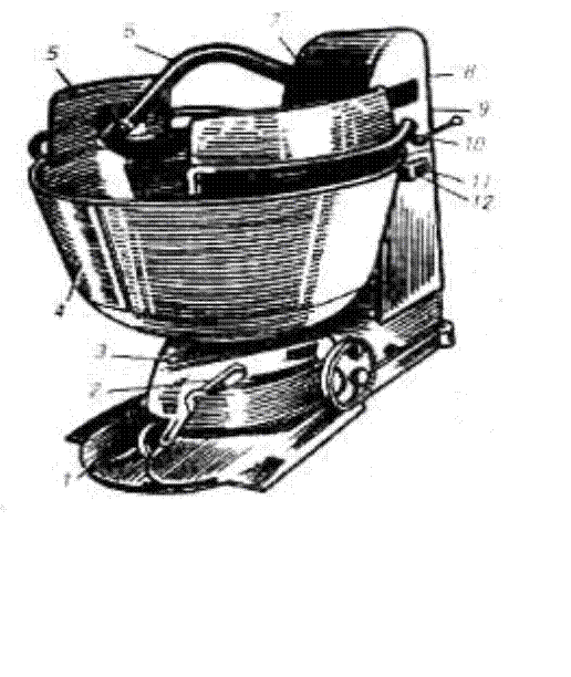 1 – фундаментальная плита, 2 – педаль, 3 – тележка, 4 – дежа, 5 – щиток,