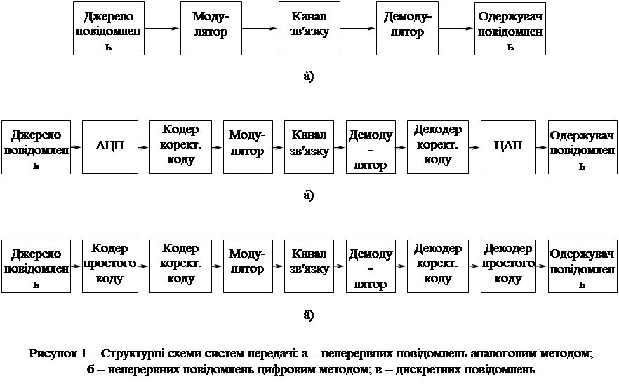 ( 6. Розрахунок ефективності системи передачі дискретних повідомлень . Виконати розрахунки і порівняння інформаційної, енергетичної і частотної ефективності системи зв'язку, що розраховується, для двох варіантів передачі – з завадостійким кодуванням і без нього. Побудувати графік граничної залежності b = f (g). На цьому рисунку точками відбити ефективність двох варіантів передачі. Порівняти ефективність двох варіантів передачі між собою і з граничною ефективністю. Зробити висновки за результатами порівняння. 7. Заключення . Зробити висновки по курсовій роботі в цілому. 2. СТРУКТУРНА СХЕМА СИСТЕМИ ПЕРЕДАЧІ ПОВІДОМЛЕНЬ У цьому розділі КР необхідно навести опис структурної схеми системи електрозв'язку, принципу дії і особливостей роботи окремих блоків для заданого виду повідомлення і способу передачі (кодування і модуляції). При описі необхідно дати визначення основних параметрів, що характеризують кожний блок, і навести часові діаграми характерних сигналів на входах і виходах блоків. При розгляді систем передачі неперервних повідомлень вважають, що первинний сигнал b