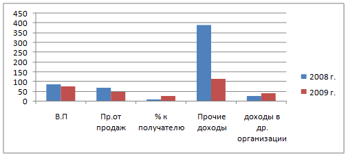 В 2008 г. кредиторская задолженность превышает дебиторскую задолженность на 1277200 руб., а краткосрочная дебиторскую задолженность на 161428 руб. Таким образом вся кредиторская задолженность в 2,39 раза больше дебиторской задолженности, что гораздо больше нормального уровня 10 – 20%. Это говорит о том, что предприятие нерационально использует собственные средства. Живет за счет других. Таким образом предприятие имеет большую долю в зависимости от кредитов. В 2009 г. ситуация ухудшилась, так как кредиторская задолженность превысила дебиторскую задолженность на 1455450, т.е. кредиты больше займов в 16,08 раза, что также на много выше нормы, а ККЗ превышает КДЗ на 146092 руб. Предприятию следует обратить особое внимание на свои долгосрочные обязательства и выплаты по дивидендам, так как могут возникнуть проблемы с банками в виде штрафов и акционерами по выплате %, а также возможной потери репутации. 2.9 Анализ экономической эффективности и рентабельности Любое предприятие создается для получения прибыли, то есть прибыли от основной деятельности. Проанализируем в таблице №13 основные виды доходов и изобразим на рисунке. Табл. 13. Анализ состава и структуры доходов предприятия