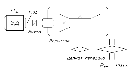 Задание Спроектировать привод к конвейеру по схеме (рис.1). Механизм привода состоит из конического редуктора и цепной передачи. Исходные данные для проектирования: 1.Мощность на ведомой звездочке N2 = 2,5 кВт 2.Угловая скорость на ведомой звездочке = 8 рад/с