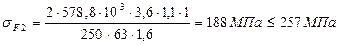 Диаметры окружностей выступов dai =di +2m ; (4.9) da1 =69+2·1,6=72 мм; da 2 =250+2·1,6=253 мм. Диаметры окружностей впадин dri = di - 2,5 m ; (4.10) dr 1 =69-2,5·1,6=65 мм; dr 2 =250-2,5·1,6=246 мм. 4.4Силы, действующие в зацеплении по[3,c.113] Окружная: Ft =2 T 2 / d 1 =2·165600/69=4994 Н. (4.11) Радиальная: Fr = Ft · tgα / cosβ = 4994·0,364/1=1818 Н. (4.12) Осевая: Fa = Ft · tgβ =4994·tg 0°=0 Н. (4.13) 4.5Проверка прочности зубьев по напряжениям изгиба по [3,с.157] где YF – коэффициент формы зуба; KF – коэффициент нагрузки, принимаем равным 1,1; Yβ – коэффициент наклона зубьев,при β=0 принимаем равным 1. Значение коэффициента формы зуба по таблице1.5[3,c.158] YF 1 =3,7 – для шестерни; YF 2 =3,6 – для колеса; (4.15)