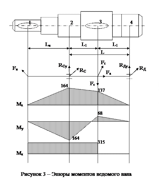 8.3.2 Строим эпюру изгибающих моментов относительно оси Х: Мx 1 =0; Mx 2 =Fв ·Lв =2359·69,5·10-3 =164H·м; Mx 4 =0; Mx 3 =Fв · (Lв +L1 )-RCy ·L1 =2359· (69,5+60) ·10-3 -2816·60·10-3 =137Н·м; Mx 3 =RД y ·L1 =2275·60·10-3 =137Н·м. Горизонтальная плоскость: ∑M4 =0; ∑M2 =0; 8.3.3 Строим эпюру эпюру изгибающих моментов относительно Y: Мy1 =0; My2 =-Fв ·Lв =-2359·69,5·10-3 =-164H·м; My4 =0; My3 =-Fв · (Lв +L1 )+RCx ·L1 =-2359· (69,5+60) ·10-3 +6221·60·10-3 =68Н·м. 8.3.4 Строим эпюру крутящих моментов: Mк =Ft ·d2 /2=4994·126·10-3 /2=315Н·м. (8.19) 8.3.5Определяем суммарные реакции, Н: