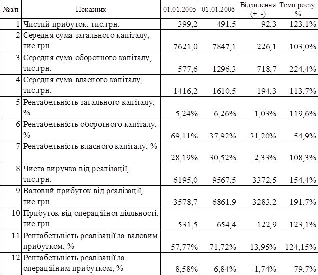 Рис.2.1. Динаміка фінансових результатів ТОВ «Едемо» в 2004-2005 рр. Чистий дохід від реалізації виріс в 1,54 рази, що супроводжувалося ростом собівартості реалізованих послуг лише на 3,4%. Таким чином, можна стверджувати, що рентабельність реалізації за валовим прибутком збільшилась. При рості обсягів реалізації в 1,54 рази чистий прибуток збільшився лише в 1,23 рази, що з огляду на структуру доходів і витрат підприємства (Додаток Д) свідчить про непропорційне зростання адміністративних витрат та інших операційних витрат. Тому керівництву ТОВ «Едемо» необхідно звернути увагу на ці статті видатків і провести аналіз обґрунтованості їх зростання. Проаналізуємо детальніше показники прибутковості підприємства та вплив обсягів реалізації на їх динаміку. Згідно [44, c. 242-246] рентабельність капіталу за «чистим прибутком» розраховується як співвідношення чистого прибутку до загальної величини капіталу, або до його окремих складових частин. Відповідно отримують наступні показники: - рентабельність загального капіталу Кзк = Пр / ЗГк (2.1) де Пр — чистий прибуток діяльності; ЗГк - середній за період підсумок балансу-нетто. Сутність цього показника в тому, що він показує ефективність використання всього майна підприємства. Зниження Кзк також свідчить про падаючий попит на продукцію фірми і про перенагромадження активів. - рентабельність оборотного капіталу Коб = Пр / Об (2.2) де Об - середня за період величина оборотних активів. Коб - відображає ефективність використання оборотних активів, вимірювану величиною прибутку, що приходиться на одиницю вартості коштів. Спадання Коб при підвищенні Кзк свідчить про надлишкове збільшення мобільних коштів, що може бути наслідком утворення зайвих запасів товарно-матеріальних цінностей, затовареності готовою продукцією в результаті зниження попиту, надмірного росту дебіторської заборгованості або коштів. - рентабельність власного капіталу Квк = Пр/ Влк (2.3) де Влк - середня за період величина власного капіталу. Квк - показує ефективність використання власного капіталу. Динаміка Квк впливає на рівень котирування акцій на фондових біржах. Рентабельність продукції є співвідношенням прибутку від реалізації продукції до виторгу: КПР = ПР /N (2.4) де N — виторг від реалізації продукції (робіт, послуг); Пр — прибуток від реалізації продукції (робіт, послуг). Кпр - показує, скільки прибутку приходиться на одиницю реалізованої продукції. Ріст Кпр є наслідком росту цін при постійних витратах на виробництво реалізованої продукції (робіт, послуг) або зниженні витрат на виробництво при постійних цінах. Зменшення свідчить про зниження цін при постійних витратах на виробництво або про ріст витрат на виробництво при постійних цінах, тобто про зниження попиту на продукцію підприємства. Відповідні дані і розрахунки представлені в табл.2.2. Таблиця 2.2 Аналіз рентабельності діяльності ТОВ «Едемо»
