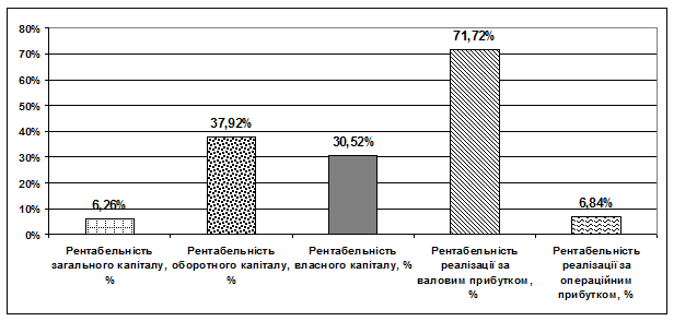 Згідно проведених у табл.2.2 розрахунків, що ілюструються діаграмою на рис.2.2, ТОВ «Едемо» має високі показники рентабельності власного і оборотного капіталу і реалізації за валовим прибутком, що продовжували зростати протягом 2005р. Натомість, рентабельність реалізації за операційним прибутком різко зменшилась від 8,58% до 6,84%, що свідчить про значний ріст постійних витрат (адміністративні витрати і інші операційні витрати). Отже, підприємству необхідно шукати резерви росту прибутку в зниженні витрат за вказаними статтями.