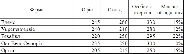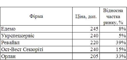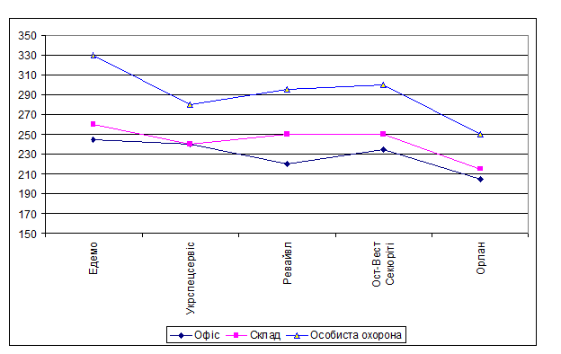 Таким чином, основною проблемою внутрішнього середовища ТОВ «Едемо» є відсутність достатніх коштів для фінансування маркетингових досліджень і стратегічного планування. Натомість, для проведення зваженої політики ціноутворення ці аспекти управлінської діяльності є основними. Тому ми звертаємо увагу керівництва підприємства на необхідність проведення хоча б камеральних досліджень ринку. Порівняємо ціни ТОВ «Едемо» з цінами конкурентів для визначення верхньої межі. Відповідні дані за обраною групою послуг (охорона приміщень) представлені в табл.2.9 і проілюстровані діаграмою на рис.2.4. Таблиця 2.9 Ціни на послуги охорони у місті Києві (дол.)[68]