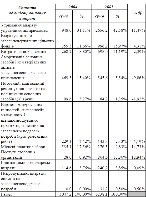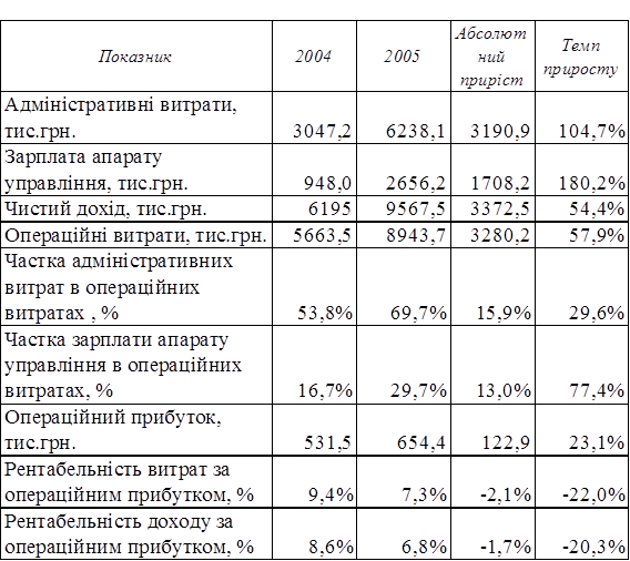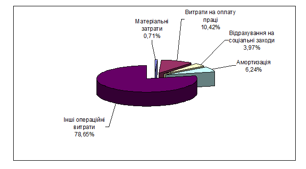 Таким чином, в 2005 р. операційні витрати виросли в 1,58 разів. При цьому зменшились матеріальні затрати на 8,46% і амортизаційні відрахування – на 1,98%. Натомість, значно зросли витрати на оплату праці працівників основного складу – на 39,54%, і відповідні відрахування на соціальні заходи. В складі інших операційних витрат значно зросли адміністративні витрати (в 2,1 рази за даними Додатку Б). Структура операційних витрат, понесених протягом 2005 року, представлена на рис.2.5.