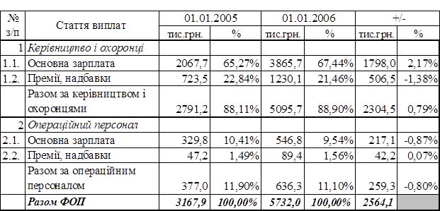 Рис.2.5. Структура операційних витрат ТОВ «Едемо» в 2005 р. З огляду на отримані результати, доцільно проаналізувати динаміку оплати праці на підприємстві і порівняти її з динамікою росту доходності і продуктивності праці. Структура розрахунків з персоналом, що враховує посадові оклади, виплати за системою мотивації (премії, доплати) представлена в табл.2.12. Таблиця 2.12 Структура розрахунків з персоналом ТОВ «Едемо»