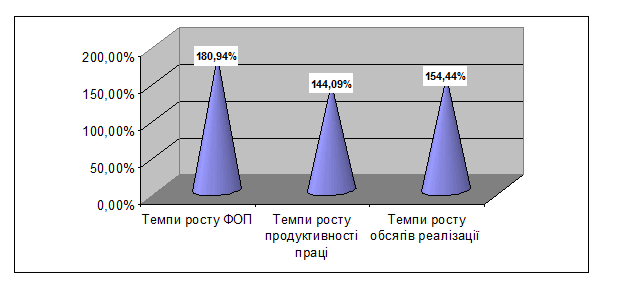 Згідно розрахунків, продуктивність праці в цілому по підприємству зросла на 44,1% і склала в 2005 р. 53,4 тис. грн. на одного працівника. В розрахунку на одного охоронника приріст був ще більшим – 48,6%. Кожний охоронник в 2005 р. забезпечив надходження 72,5 тис. грн. виручки від реалізації послуг для фірми. Темпи приросту обсягів реалізації (54,4%) відстають від темпів приросту ФОП (80,9%), що є ознакою соціальної складової при розробці політики оплати праці. Розрахуємо суму економії (перевитрат) ФОП у зв’язку зі зміною співвідношень росту продуктивності праці і його оплати [55, c.219]: ± Е = ФОП 2005 * (Ісз – Ірв) / Ісз де Ісз – індекс росту середньої заробітної плати, І рв – індекс росту середньорічного виробітку. ± Е = 5732,0 * (1,809 – 1,441) / 1,809 = 1166,0 тис.грн. Таким чином, перевищення темпів росту оплати праці над темпами росту продуктивності праці привело до перевитрат ФОП в розмірі 1166,0 тис.грн. Порівняльна діаграма темпів росту ФОП, продуктивності праці і обсягів реалізації представлена на рис.2.6.